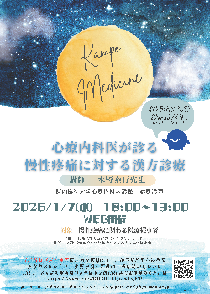 - 兵庫医科大学主催セミナー(心療内科医が診る慢性疼痛に対する漢方診療)を開催します