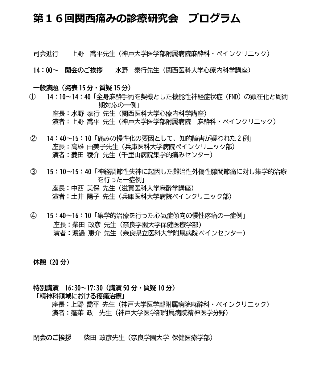 第16回関西痛みの診療研究会 プログラムをアップしました