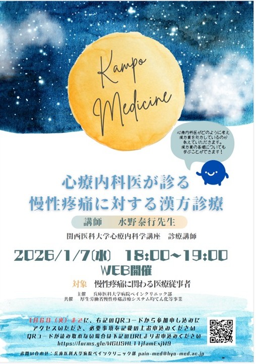 兵庫医科大学主催セミナー(心療内科医が診る慢性疼痛に対する漢方診療)を開催します